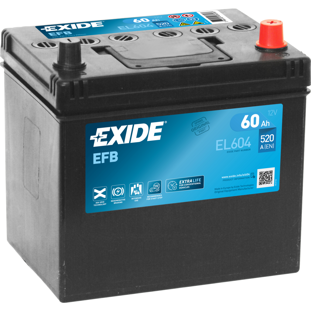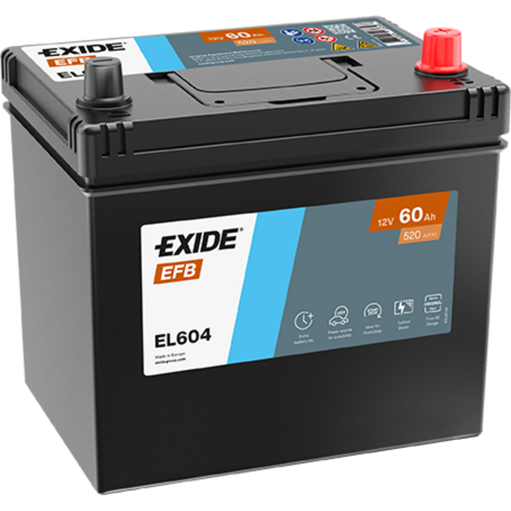 La Exide EL604 es una batería EFB (Enhanced Flooded Battery), diseñada para vehículos con sistemas start-stop y mayores necesidades energéticas. Su avanzada tecnología permite una carga más eficiente, mayor durabilidad y una mejor resistencia a ciclos profundos en comparación con baterías estándar.